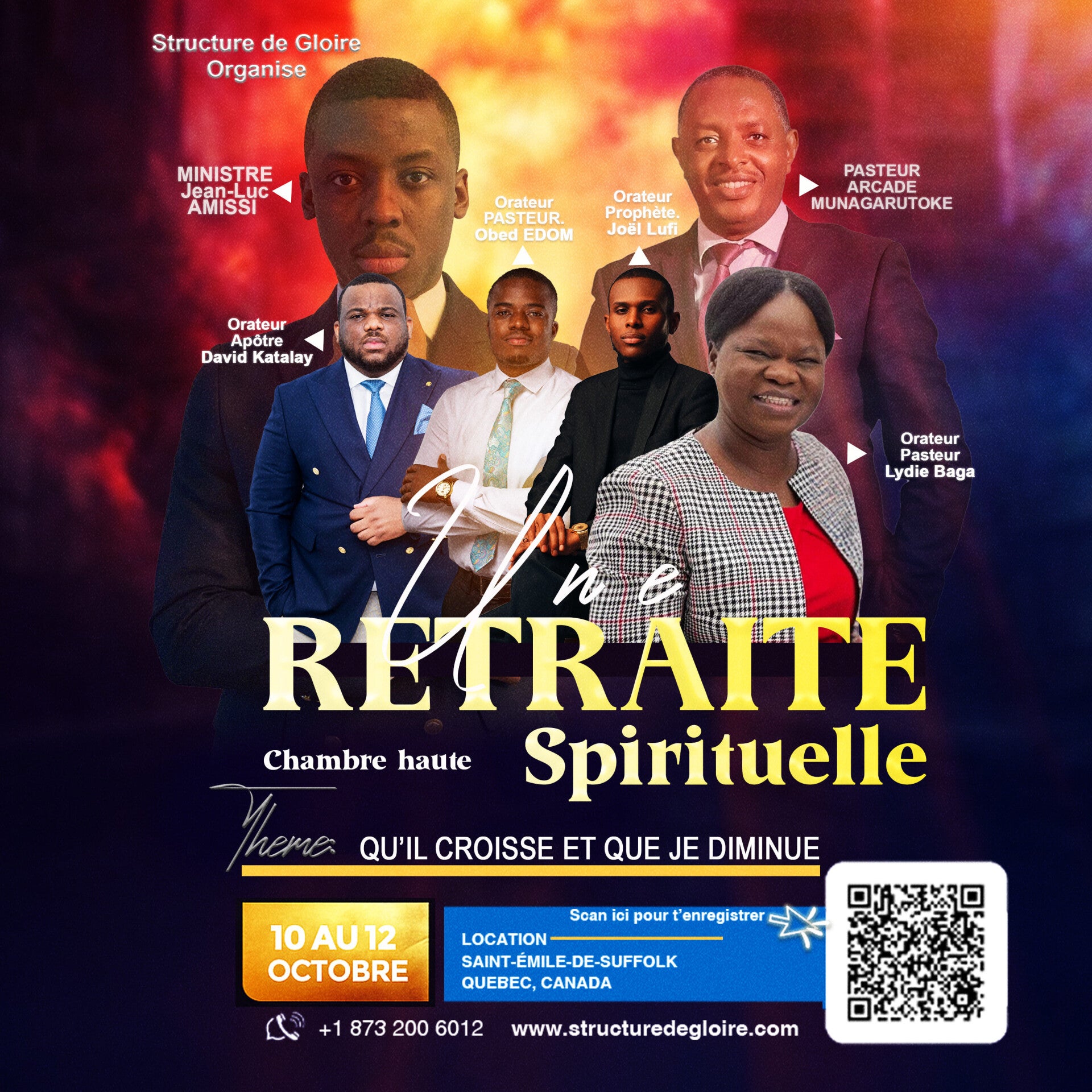 Pour vous enregistrer et confirmer votre participation à la Retraite Chambre Haute organisée par Structure de Gloire, veuillez envoyer vos informations personnelles (nom complet, adresse, numéro de téléphone et adresse courriel) puis effectuer votre contribution en suivant les instructions ci-dessous :